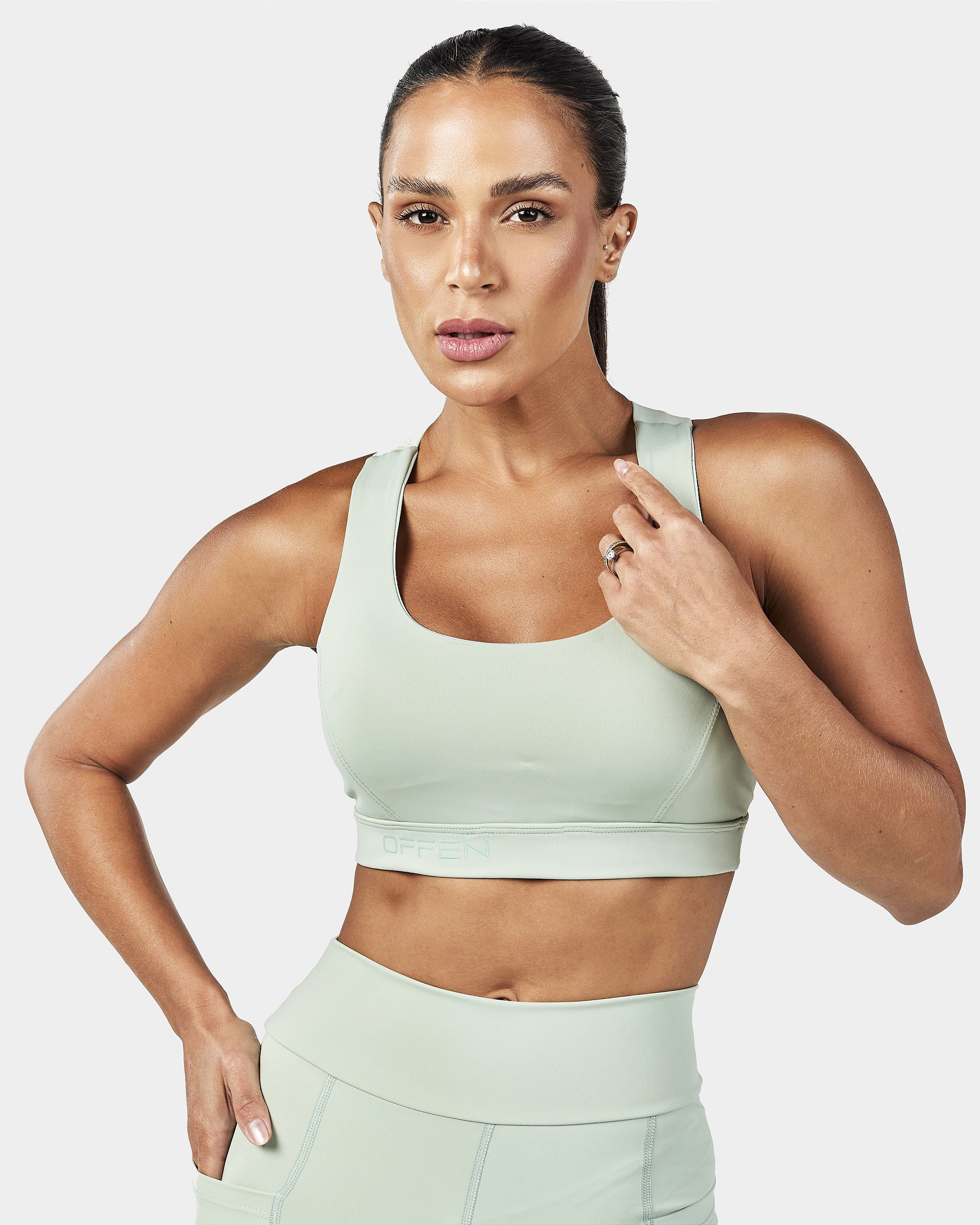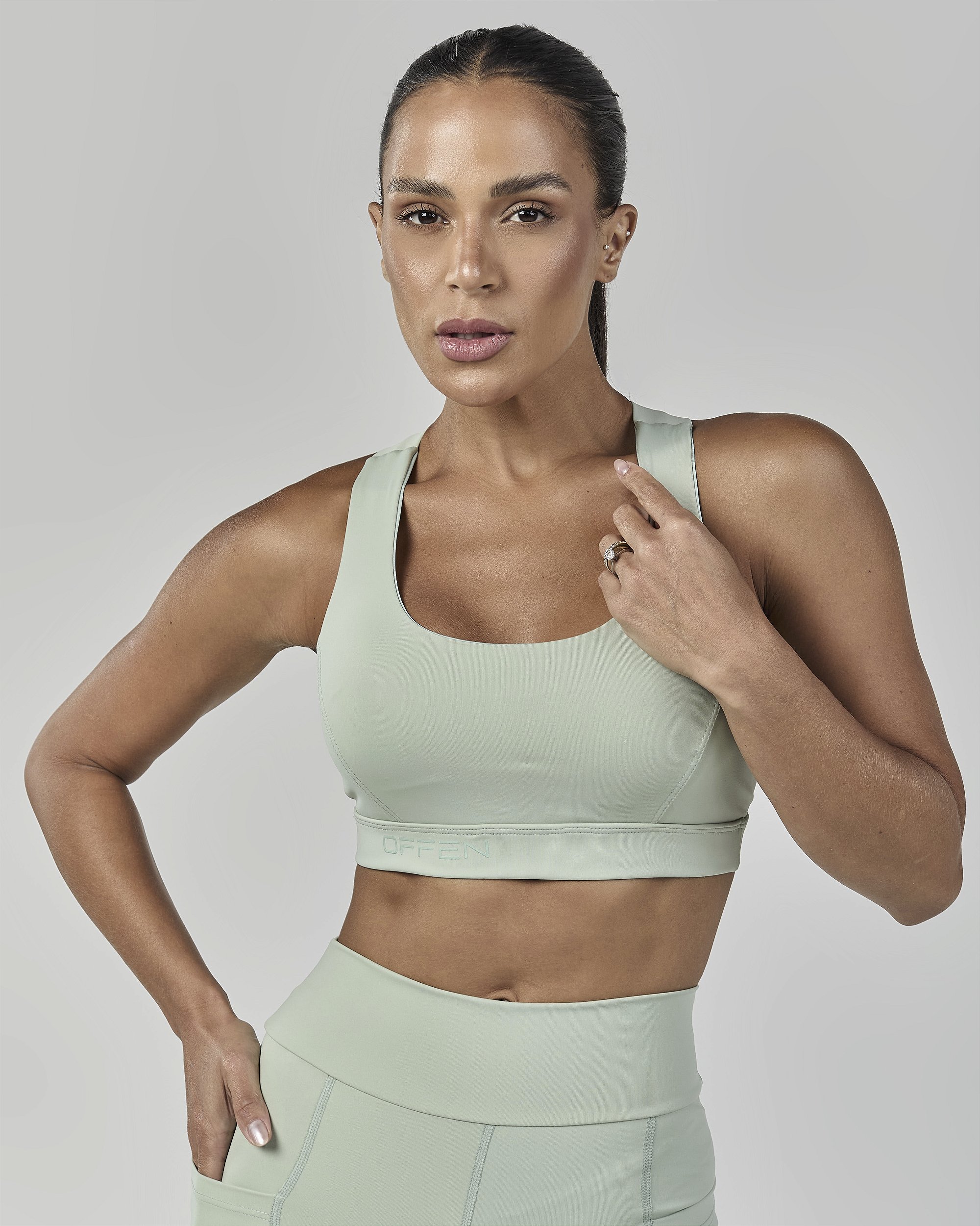 Top em tecido de compressão e alças cruzadas com elástico interno, proporcionando uma sensação de conforto e firmeza. O bojo removível oferece versatilidade, permitindo o ajuste do top de acordo com sua preferência pessoal.